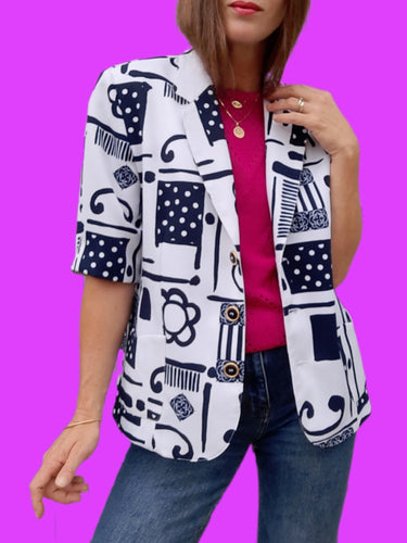 Veste vintage Lucie - Imprimé abstrait bleu marine et blanc. Taille L, 40, 42. Claude Bauer